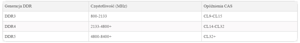 Porównanie różnych generacji RAM pod względem częstotliwości i opóźnień: