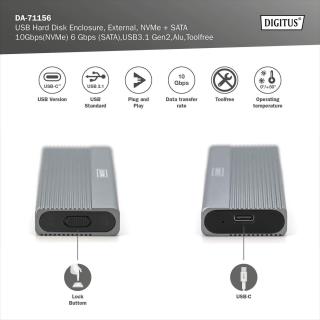 Obudowa DIGITUS USB 3.1 Typ C na dysk SSD M.2 NVMe 10Gbps + SATA 6Gbps aluminiowa, beznarzędziowa