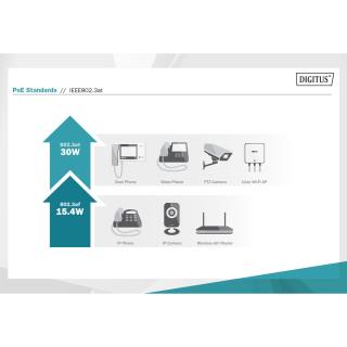 - Standard PoE: IEEE802.3at