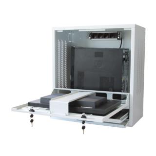 - Dolna komora zamykana na klucz z wysuwaną półką na klawiaturę