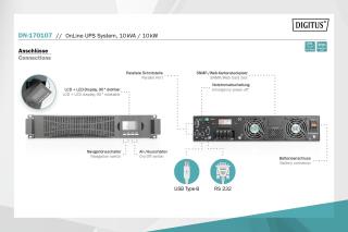 Zasilacz awaryjny UPS DIGITUS Online Rack 19" 10000VA/10kW, 2U, USB, RS232, bez baterii (moduł baterii DN-170108)